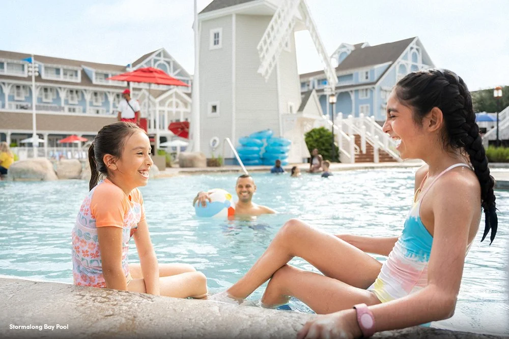 Stormalong Bay, centrally located between Disney’s Beach Club Resort and Disney’s Yacht Club Resort, is a 3-acre pool complex with a life-size shipwreck replica, sand-bottom pools, lazy river, waterfall, and one of the highest resort waterslides on Walt Disney World property. It has a poolside bar and grill, shallow area for kids, and an elevated tanning deck. The pool area faces Crescent Lake. There are also ‘quiet pools’ closer to the resort buildings for a relaxed swim or soak in a hot tub.